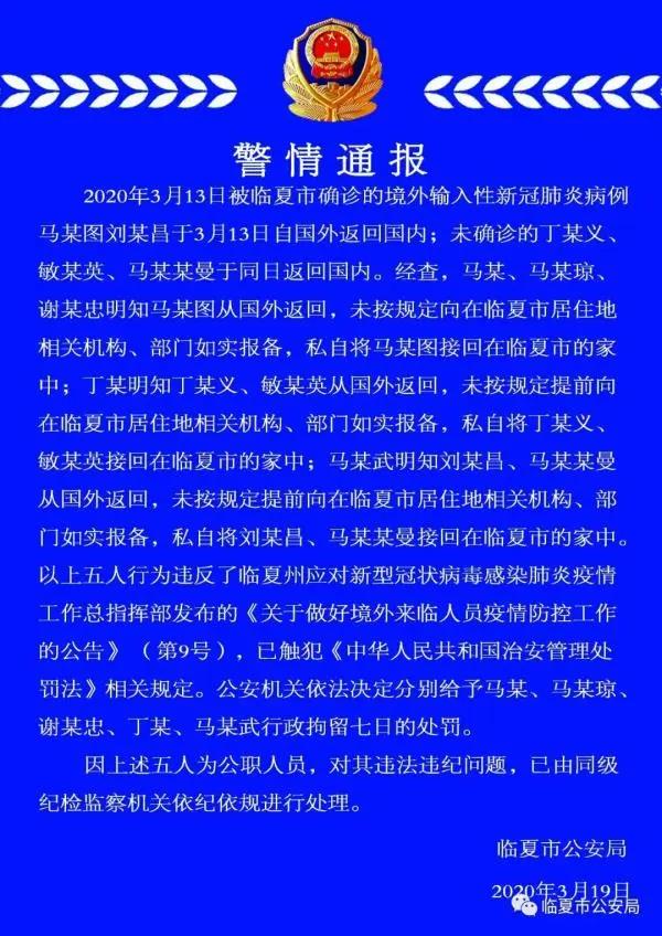 甘肃省临夏回族自治州临夏市公安局发布警情通报称,3月13日被临夏市确诊的境外输入性新冠肺炎病例马某图、刘某昌于3月13日自国外返回国内;未确诊的丁某义、敏某英、马某某曼于同日返回国内。而私自将他们接回国的五位公职人员,被处行政拘留七日,同时同级纪检监察机关也将依法依规进行处理。